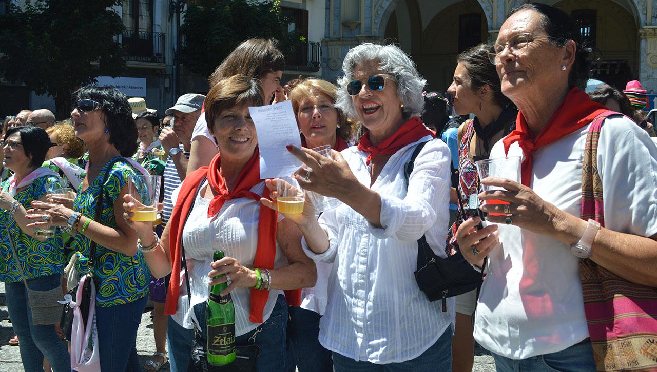 Brindisera argazkia ateratzera gerturatu eta inoiz baino jende gutxiago plaza erdian... Zer gertatzen ote? Bazterretara begiratu eta hantxe denak itzalpean! Hala ere, Muzki koadrilako kideek hitza hartu orduko ahaztu zituzten eguzkiaren beroak. Blusa koloretsuak soinean eta basoak eskutan, giro ederrean eta kantuan egin zuten topa.