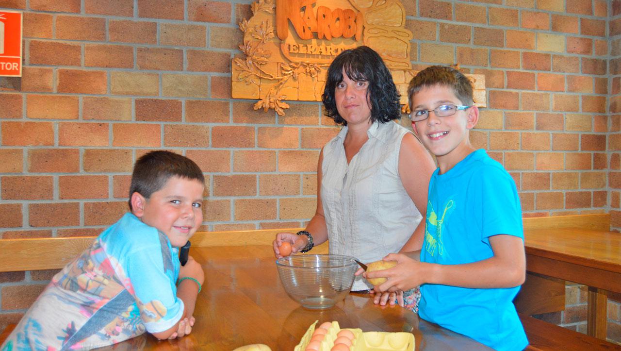 Sei esku, bi baino hobeak dira patata tortilla bat egiteko, eta formula horrekin daramazkite bost urte, Idoia Aizpuruak eta Unax eta Mikel semeek, jaietako tortilla lehiaketan parte hartzen: «hirurak aritzen gara tortilla egiten, asko gustatzen zaie beraiei ere», azaldu du Idoiak. Estrategia ere ondo definitua daukate, Unaxek azaldu bezala: «nik arrautzak puskatzen ditut, Mikelek eta biok patatak zuritu, eta su kontuak amaren esku geratzen dira». Jolas moduan hasi ziren parte hartzen, baina zerbait gehiago ere badela konturatu dira: «festei laguntzeko modu bat ere bada, gero sagardo dastaketarekin jaten baitira tortilla horiek», dio Idoiak. 40 bat lagunek hartu ohi dute parte, baina berehala bukatzen dira tortillak: «horregatik, auzotar guztiak animatu nahi ditugu, tortilla egin eta parte hartzera. Ez da ezer kostatzen, eta festei laguntzen zaie horrela».